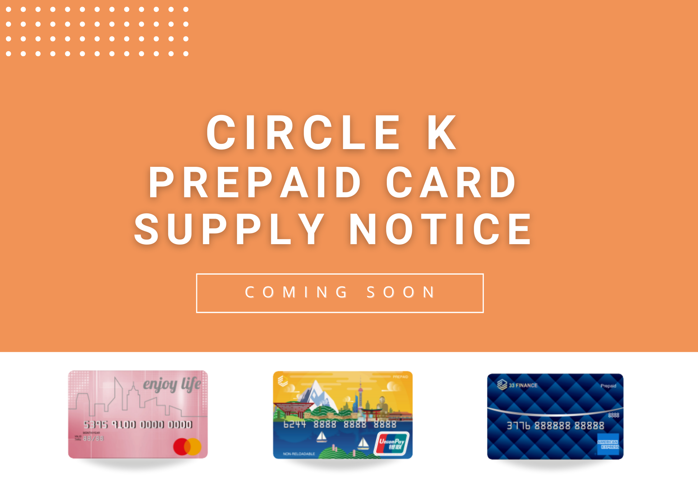 Please be informed that we will temporarily suspend the sale of 33 Finance Prepaid Cards at all Circle K convenience stores in Hong Kong until further notice. We expect to resume supply later, and we will announce the exact date in due course.